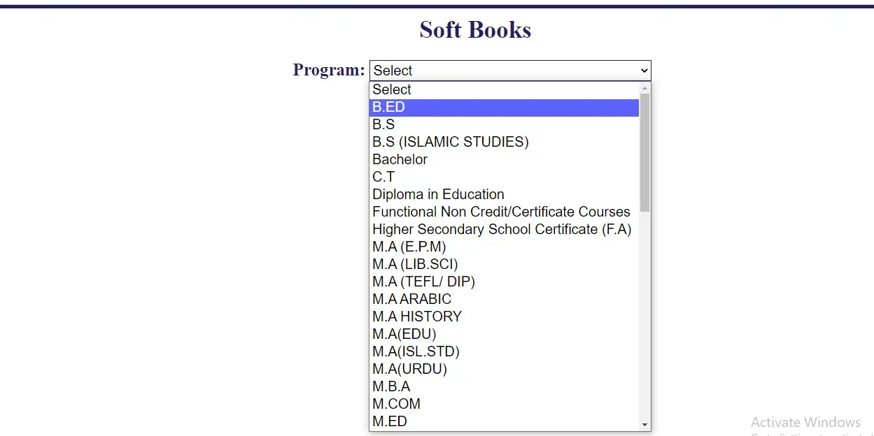 Then on the page, you will find a list of programs offered by AIOU. Select the program you are enrolled in, and it will take you to the course list for that program.