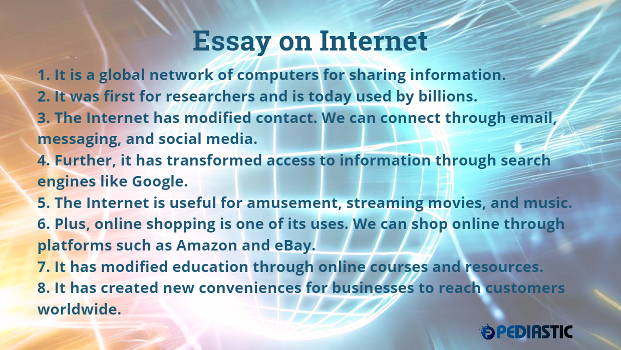 In short, the Internet is an essential part of our daily lives. It continues to grow and develop every day. The internet connects people from different cultures and countries. Besides this, we can learn new things. And we can discover new options too.
