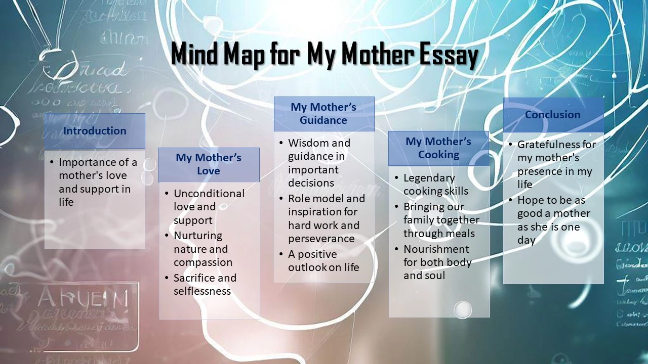 A mind map is an effective tool that helps organize ideas and information for writing essays. It allows you to visually connect and arrange different concepts and ideas related to the topic, helping you to better understand the connections and relationships between them. In the case of an essay about “My Mother,” a mind map can be particularly useful in capturing the key ideas and emotions related to your mother that you wish to express in your writing.