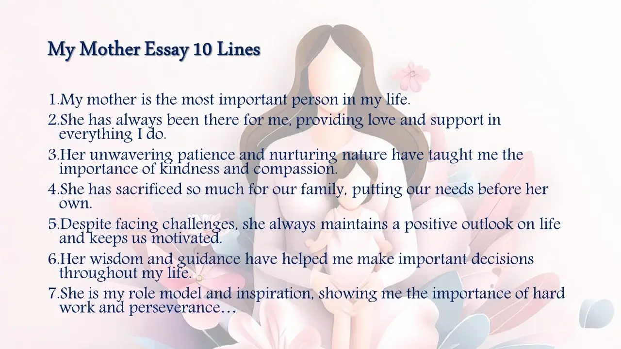 When it comes to the most important people in our lives, there is one person who stands out above all others: our mother. She is the person who brought us into this world, who nurtured and cared for us through every stage of our lives, and who continues to be a guiding light even as we grow older. For many of us, our mother is the embodiment of unconditional love and selflessness, and her influence on our lives is immeasurable. In the following “My Mother Essay”, we will explore the many facets of motherhood, and how it has shaped our lives and also the world around us.