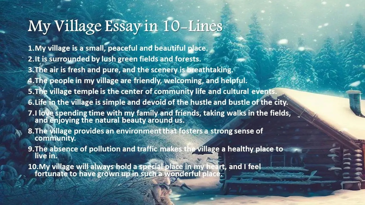 My village is a place close to my heart. It is where I grew up and where I learned the values that have guided me through life. It is a place that may seem small and insignificant to others, but to me, it is filled with memories and experiences that have shaped who I am today. In this blog post, I will be sharing with you my village essay in 10 lines, where I will take you on a journey through the beauty and simplicity of rural life. From the lush green fields to the friendly neighbors, my village has a charm that is hard to resist.